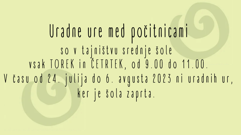 Uradne ure med počitnicami – tajništvo srednje šole 3. julija, 2023 Štefanija Kos Zidar, direktorica Nazaj Naprej